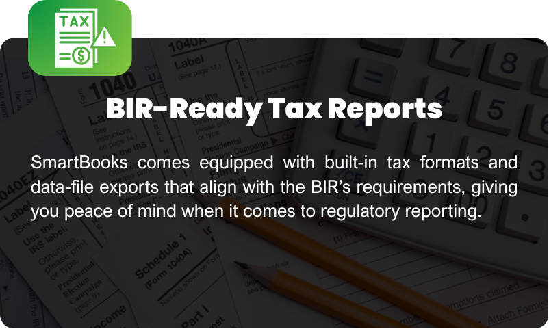 Yes, SmartBooks includes ready-to-use tax reports and data-file exports configured for BIR requirements, reducing the compliance burden.