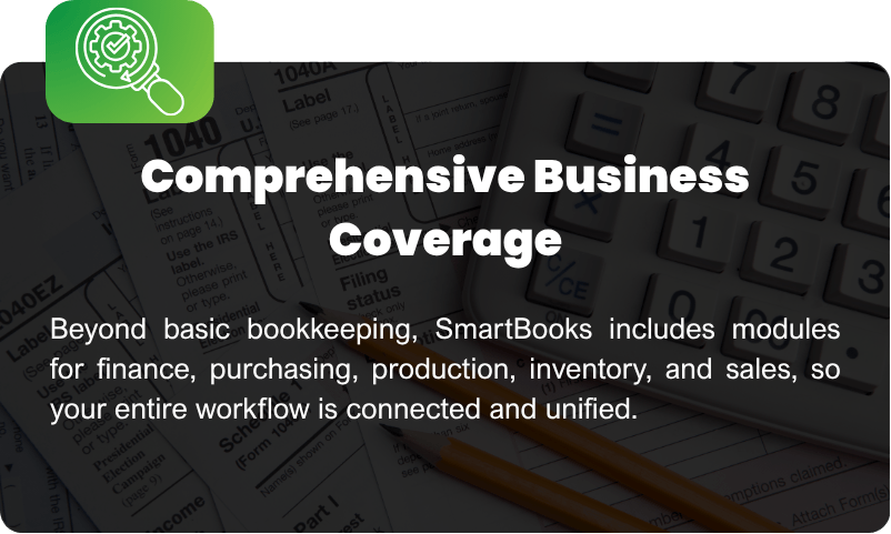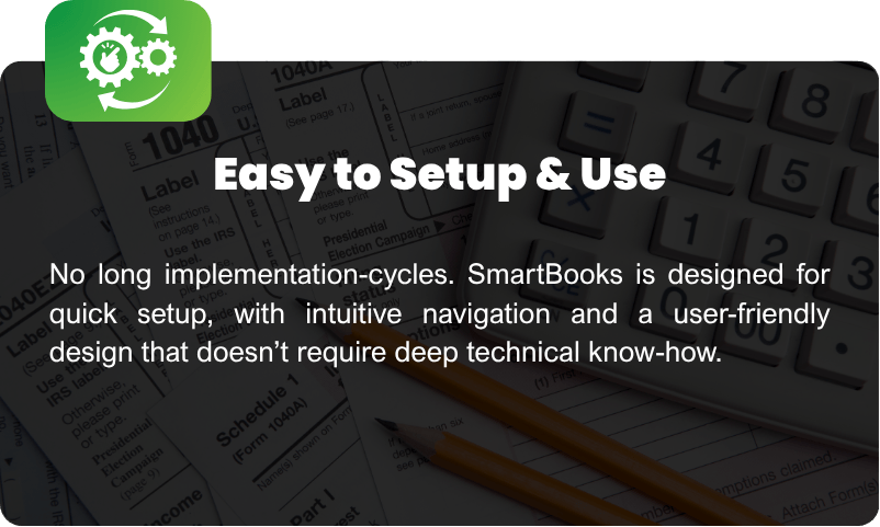 SmartBooks brings everything you need to manage your business in one cloud-based platform, from tax compliance to real-time reporting. Designed for ease, efficiency, and reliability, it connects all your core operations while keeping your data secure and accessible anywhere.